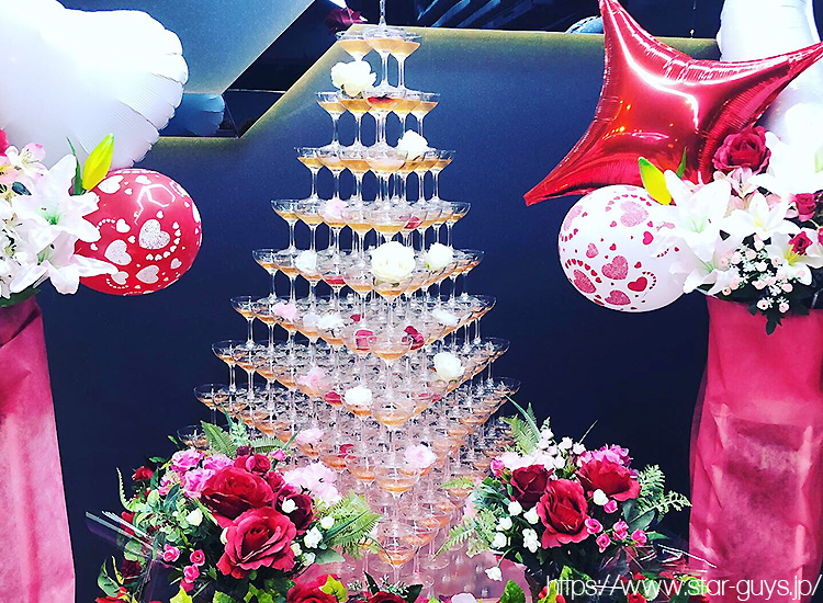 まず初めに バルーンと花で飾られた10段のシャンパンタワーが店内に飾られているのを発見!!!